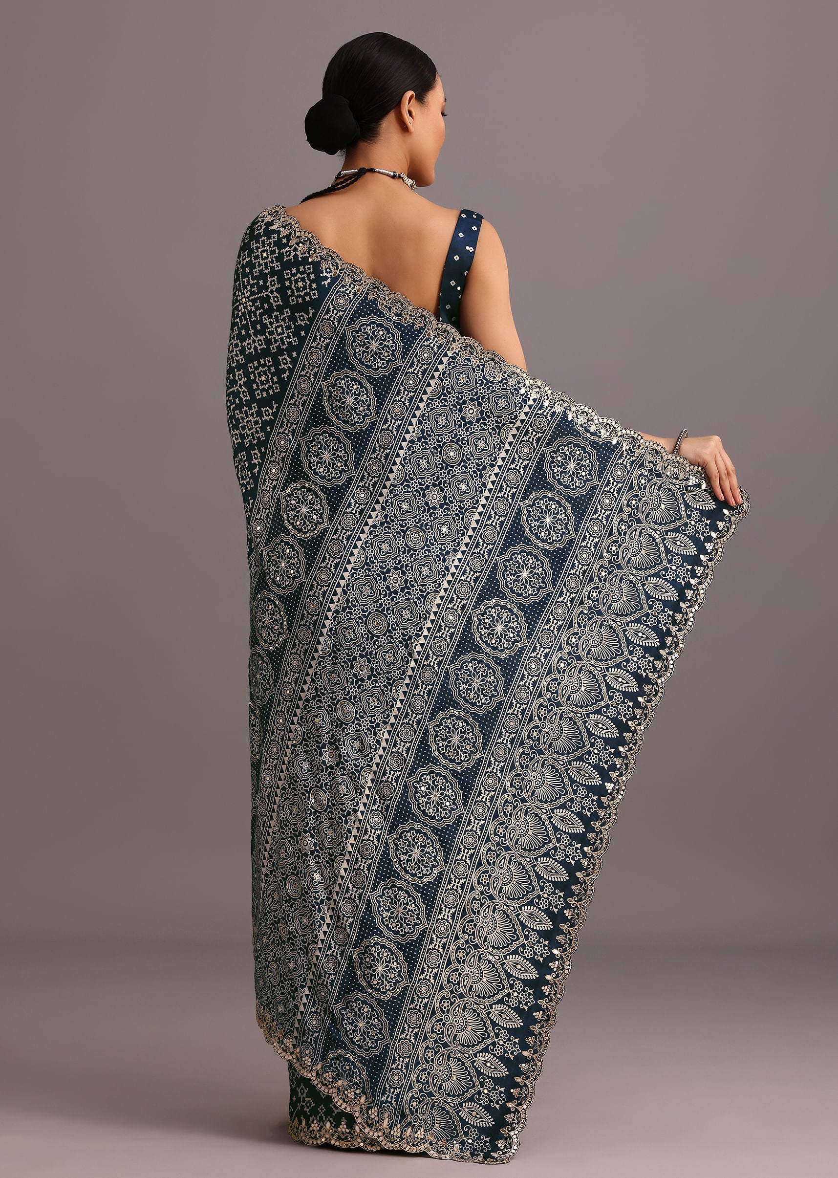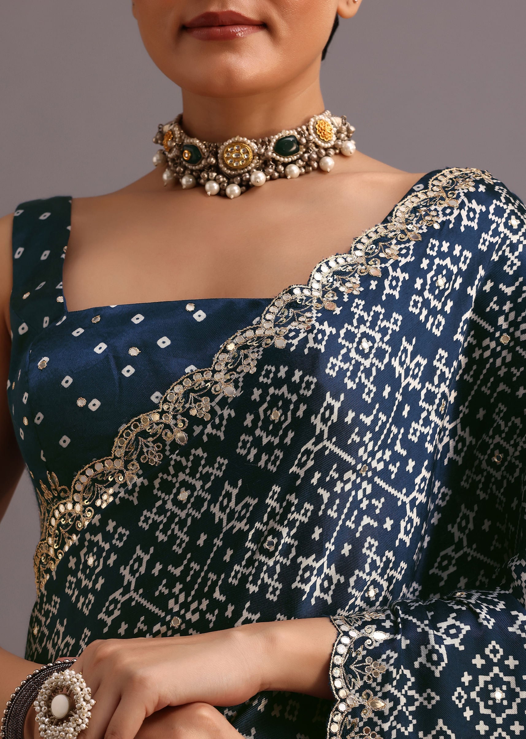 Blue Indigo Mirror And Ajrakh Print Embroidered Saree