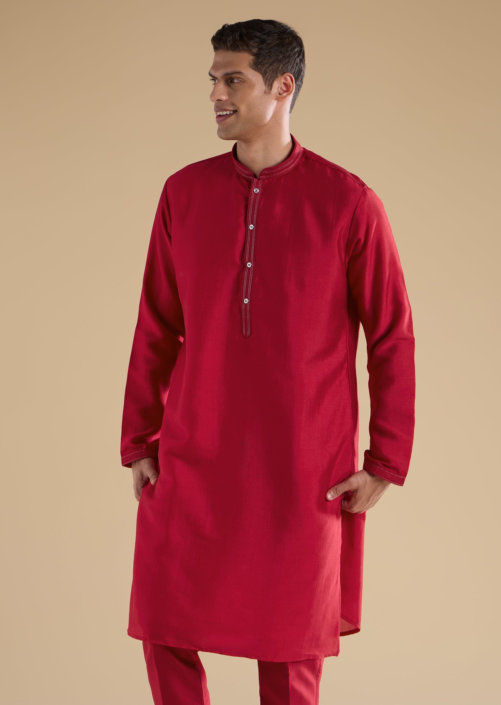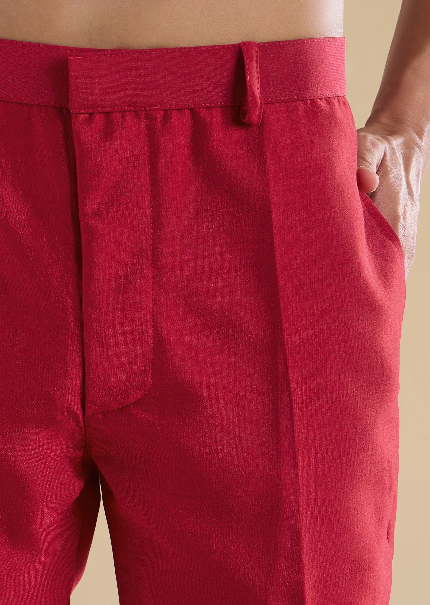 Rich and celebratory, this red kurta jacket set is crafted in smooth art silk for a classic wedding look. The kurta features a mandarin collar and full sleeves, paired with an embroidered jacket detailed with resham thread and cut dana work for refined elegance. Finished with straight-fit trousers, this ensemble is perfect for engagement, mehendi, and wedding celebrations. Awarded as the Most Trusted Brand, we're delivering styles you love, just as promised.
