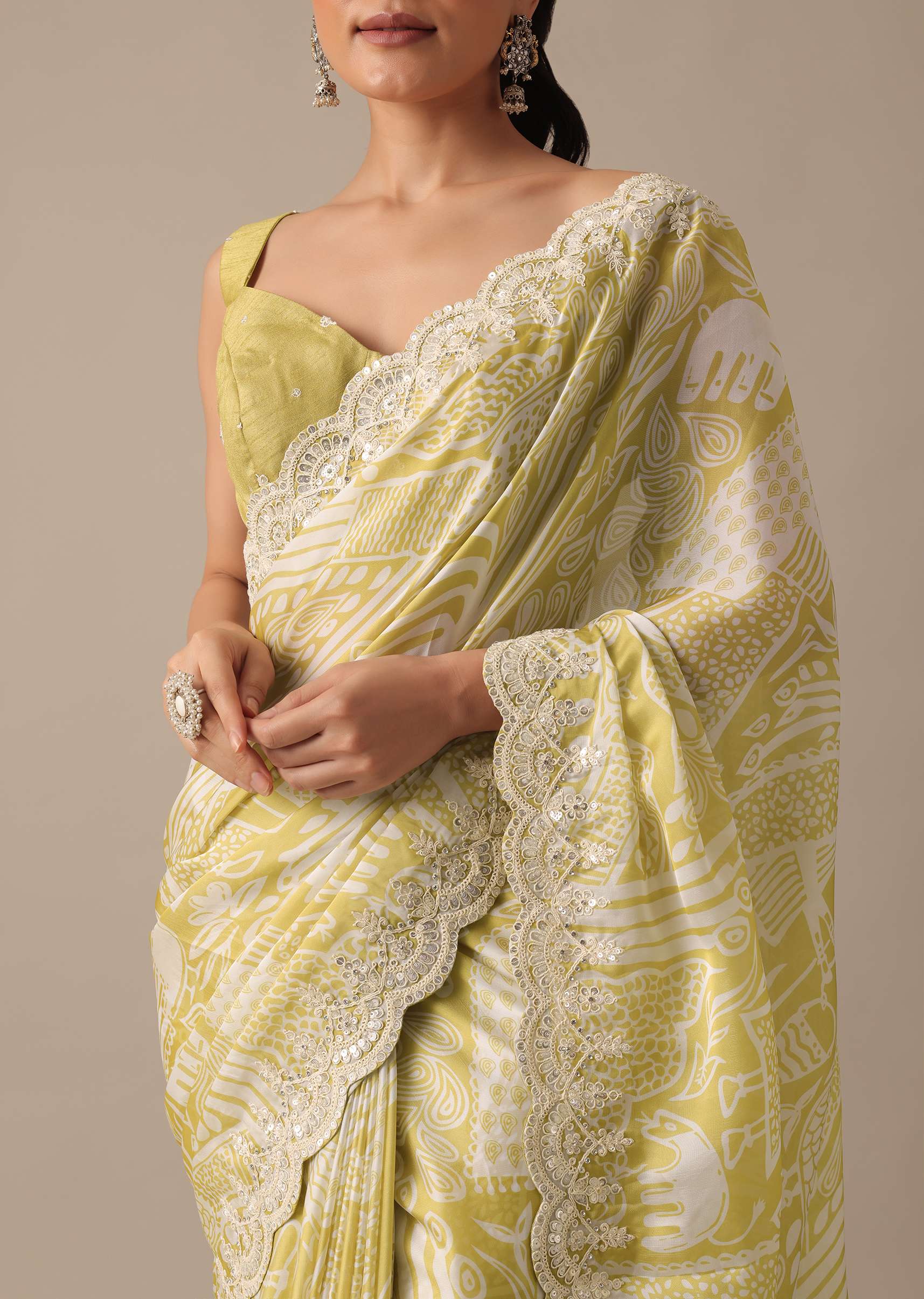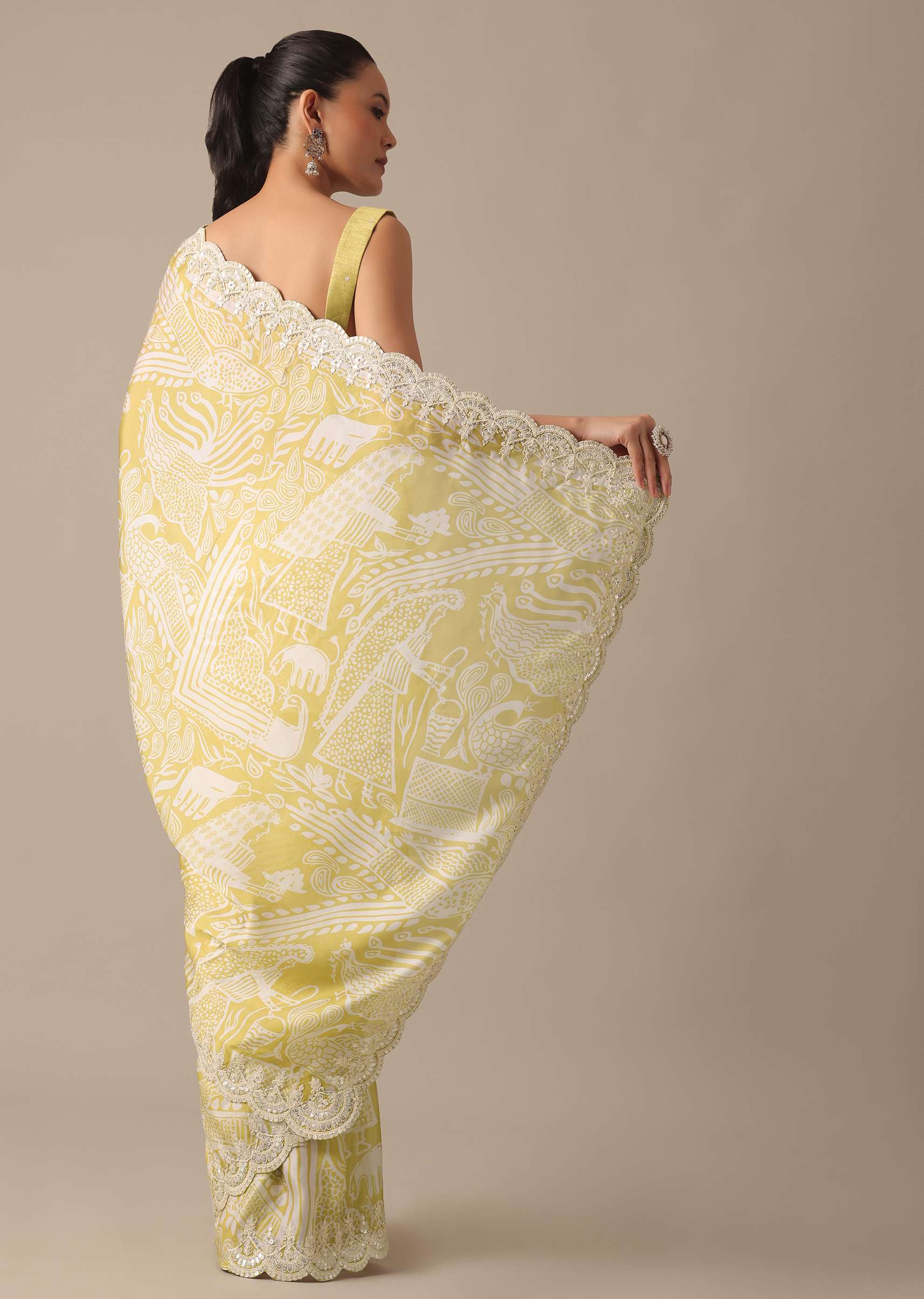 Lend an alluring charm by donning this printed saree at the next festive get-together. Fabricated using high-quality satin fabric, it is adorned with captivating motifs. Accentuated with shimmery sequins and thread embroidery on a yellow base, this saree comes paired with an unstitched blouse piece. Awarded as the Most Trusted Brand, we're delivering styles you love, just as promised.